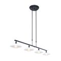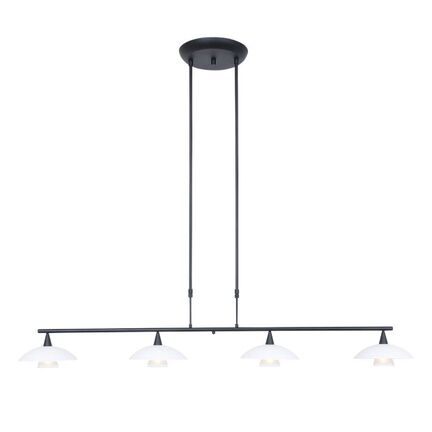 Forbedr dit interiør med den 4-lys sorte pendellampe fra denne LED-serien. Denne lampe, der er lavet af holdbart stål og i mat sort finish, tilføjer moderne elegance til ethvert rum. Designet inkluderer hvide glasfad, hver med et hvidt rør under for at forhindre direkte synlighed af LED-pærerne.