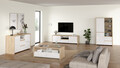 Møblerne har fleksible opbevaringsmuligheder, skjulte rum, skuffer og døre, som gør det nemt at organisere elektronik, bøger og dekorative genstande. Den lyse højglans sammen med det varme trælook giver et lyst, moderne udtryk, der passer ind i både stue, medieområde og spisestue.