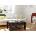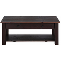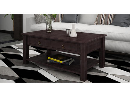 Bordet er udstyret med to rummelige skuffer og en praktisk hylde under bordpladen, som giver ekstra opbevaringsplads til fjernbetjeninger, magasiner eller andre hverdagsting. Den solide bordplade og funktionelle højde gør bordet til et naturligt samlingspunkt i stuen.