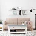Dette sofabord kombinerer et hvidmalet stel med en grå bordplade, hylde og skuffer, hvilket skaber et moderne og stilrent udtryk i stuen. Den harmoniske farvekombination gør bordet nemt at integrere i både lyse og mørke indretninger.