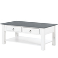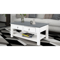 Sofabord med hvidt stel og grå bordplade, 2 skuffer og hylde