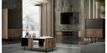 Giv hjemmet et varmt og moderne udtryk med denne stilrene møbelserie. Serien kombinerer laminat i valnød-look med sorte detaljer og sorte metalben, hvilket skaber et elegant og moderne udtryk i rummet. De varme trætoner møder minimalistiske sorte kontraster, og designet er gennemført med rene linjer og praktisk funktionalitet.