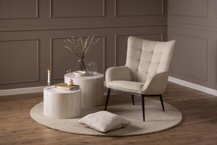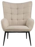 Skab en indbydende og komfortabel siddeplads med denne elegante hvilestol, som kombinerer moderne design og behagelig komfort. Betrækket i blødt beige stof giver et lyst og varmt udtryk, der passer ind i både klassiske og moderne rum.