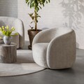 Denne elegante 1-personers loungestol kombinerer moderne komfort med et stilrent og indbydende design. Stolen er betrukket med slidstærkt Juto-stof i en varm beige nuance, der tilfører rummet et roligt og harmonisk udtryk.