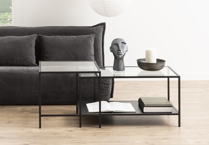 Elegant sofabordssæt i moderne design med rene linjer og let udtryk. Bordene har bordplader i klart hærdet glas, stel i matsort pulverlakeret stål samt praktisk sort træhylde under bordpladen til opbevaring.
