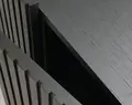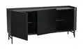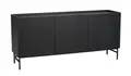 Denne skænk er udført i sortlakeret egetræ med en overflade af solide egetræssprosser på finér, hvilket giver møblet et moderne og levende udtryk. Det elegante stel i sort metal understøtter den stramme og stilrene profil.