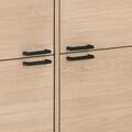 Dette elegante skab kombinerer lyse, naturlige trætoner med markante sorte detaljer og skaber et stilrent udtryk med moderne kant. Den hvidpigmenterede, olierede egefiner fremhæver træets struktur og giver møblet et roligt, nordisk look, som passer ind i både moderne og klassiske indretninger.