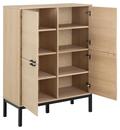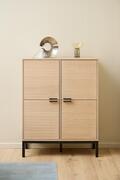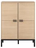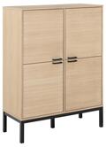 Skabet er indrettet med fire låger og seks hylder, som giver god og overskuelig opbevaringsplads til alt fra service og bøger til hverdagens nødvendigheder. Stellet i mat sort NC-lakeret eg med lamelfront tilfører dybde og kontrast og understreger møblets eksklusive udtryk.