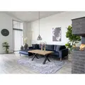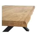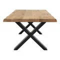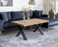 Dette robuste sofabord i natur eg kombinerer en kraftig bordplade i plankebordsstil med metal X-ben, hvilket giver bordet et tidløst og industrielt udtryk. Den bølgede kant på bordpladen tilføjer et unikt og håndlavet præg, som gør bordet til et dekorativt centrum i stuen.