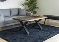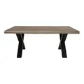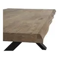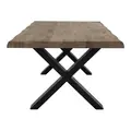 Dette robuste sofabord i smoked eg kombinerer en kraftig bordplade i plankebordsstil med metal X-ben, hvilket giver bordet et industrielt og tidløst udtryk. Den bølgede kant på bordpladen tilføjer et unikt og håndlavet look, som gør bordet til et dekorativt centrum i stuen.