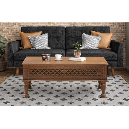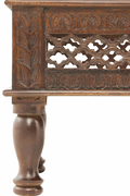 Dette sofabord er fremstillet i massivt mangotræ med en mørkbrun finish, som fremhæver træets naturlige årer og struktur. Bordets rustikke design giver stuen varme og karakter og passer perfekt til både klassiske og moderne indretninger med naturlige materialer.