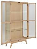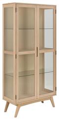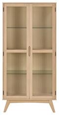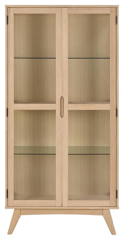 Vitrinen er udstyret med to låger i klart, hærdet glas kombineret med egefiner, hvilket giver et let og åbent udtryk. Indvendigt finder du tre hylder i egefiner og glas, som giver rig mulighed for både opbevaring og elegant udstilling af service, glas og dekorative genstande. Top, ramme og stel er udført i matchende hvidpigmenteret egefiner for et harmonisk helhedsindtryk.